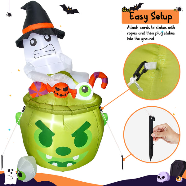 Playful ghost pulling a candy potion bottle A cute ghost wearing a witch's hat drags a magic candy pot filled with candy—the perfect companion for children's favorite trick-or-treating night in the yard