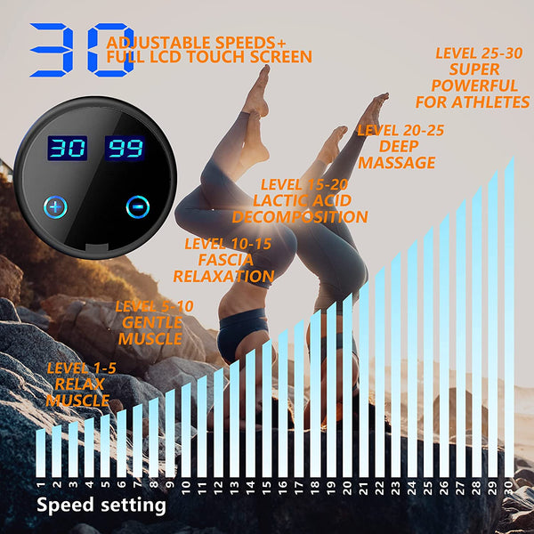 • 30 SPEED LEVELS — The massage gun deep tissue is designed with 30 massage speed modes so that you can easily find a suitable amplitude of massager for yourself. Its hand grip adopts a granular surface non-slip design. You can hold it firmly even in high speed mode. Also, you can change the mode by gently touching the LCD screen and the power left will be displayed on the screen.