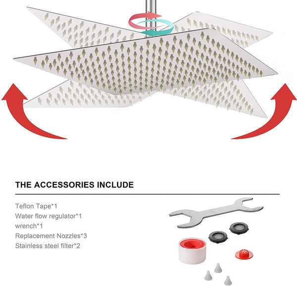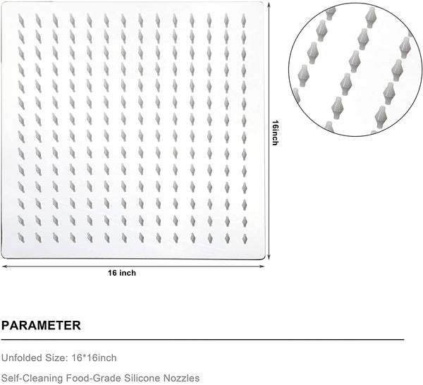 1.Powerful Rain Shower Head: This ultra thin waterfall shower head measures 16 inches with 2.5 gallons per minute water flow. And this square shower head has 324 silicone nozzles and it’s large enough to cover your whole body and provide you a relaxing bath experience.